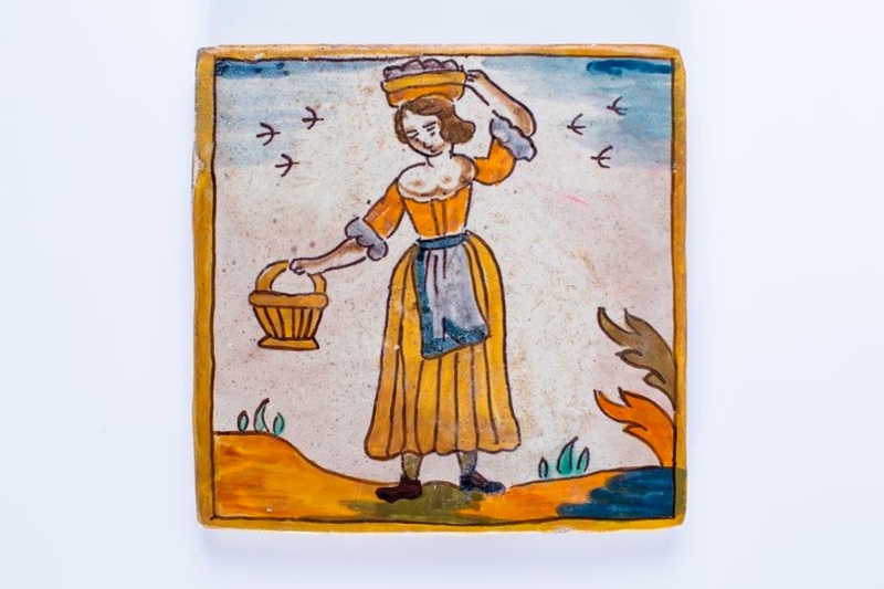 Rajola d’oficis amb marc groc amb la figura d’un candeler de cera.